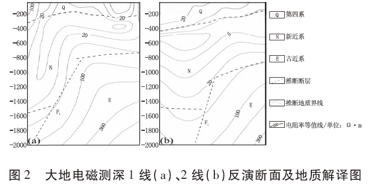 勘查區(qū)內(nèi)主要斷裂構(gòu)造均為區(qū)域性斷裂的次生斷裂,主要有NNE向張完集斷裂F1和EW 向的渦河斷裂F推1(圖1)。前人在區(qū)內(nèi)布設(shè)有兩條大地電磁測(cè)深平行剖面(1線、2線),通過(guò)明顯的“V”型寬大低阻異常和同步向下彎曲典型斷裂異常特征,于區(qū)內(nèi)東側(cè)邊界解譯推斷了走向約40°、NWW 傾的張完集斷裂F1(圖2)。渦河斷裂F推1位于勘查區(qū)南側(cè)亞珠石油城—化肥廠一線,該斷裂為亳州隆起的北界斷裂,其主要通過(guò)重力資料推測(cè)為EW 走向、N傾的正斷層。