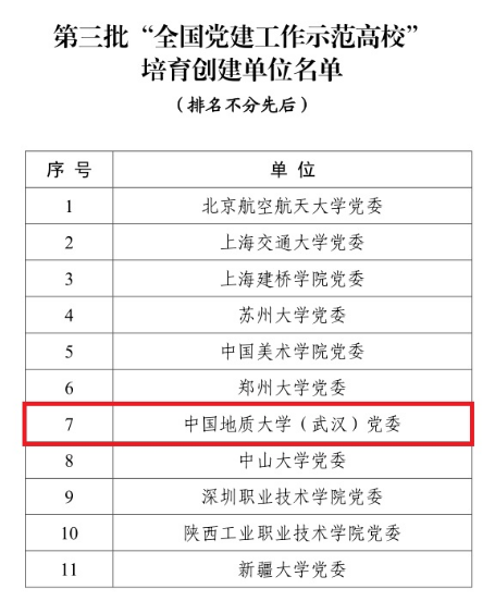 近日,教育部下發(fā)了《教育部辦公廳關于公布第三批全國黨建工作示范高校、標桿院系、樣板支部培育創(chuàng)建單位名單的通知》,公布了第三批新時代高校黨建示范創(chuàng)建和質量創(chuàng)優(yōu)工作評審結果,遴選產生了11個全國黨建工作示范高校、100個全國黨建工作標桿院系、1000個全國黨建工作樣板支部。中國地質大學(武漢)黨委入選“全國黨建工作示范高校”培育創(chuàng)建單位,環(huán)境學院“張國旗班”黨支部、工程學院勘察與基礎工程系黨支部入選“全國黨建工作樣板支部”培育創(chuàng)建單位。